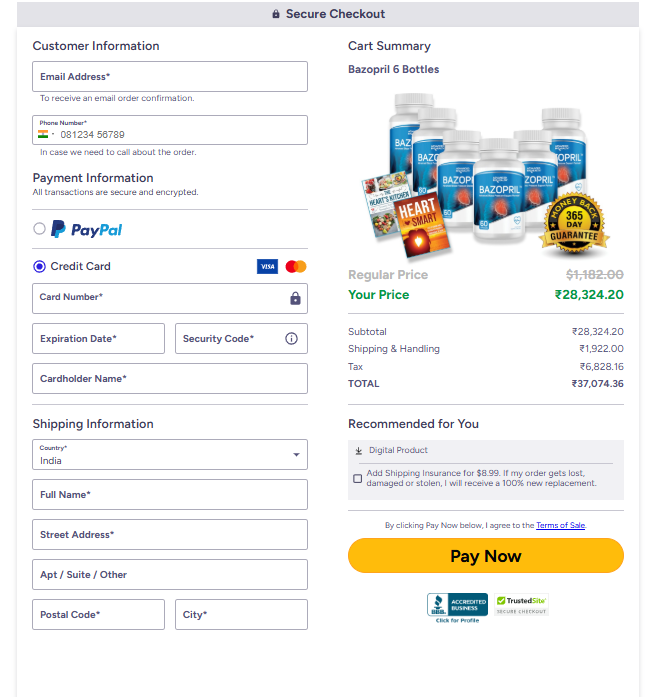 The instant you press “Buy Now,” you’ll land on our safe, SSL-encrypted payment page. Just provide your details, and your Bazopril purchase will be confirmed.