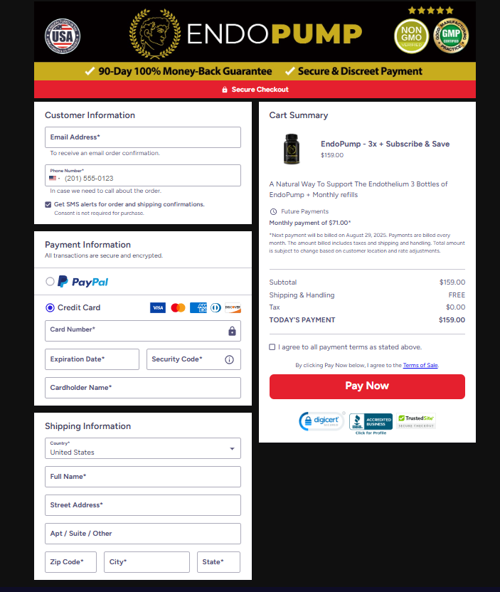 The instant you press “Buy Now,” you’ll land on our safe, SSL-encrypted payment page. Just provide your details, and your Endo Pump purchase will be confirmed.