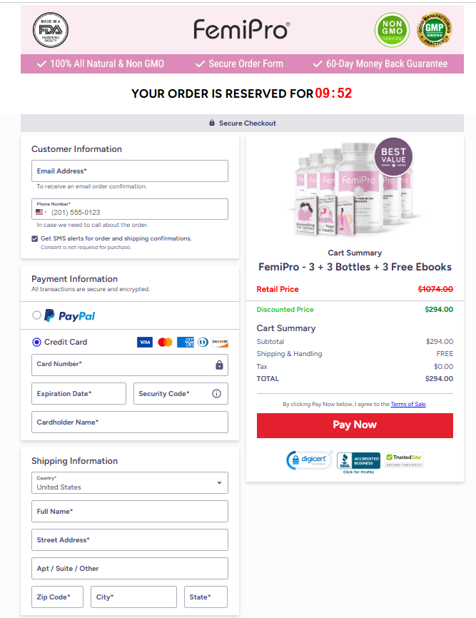 The instant you press “Buy Now,” you’ll land on our safe, SSL-encrypted payment page. Just provide your details, and your Femipro purchase will be confirmed.