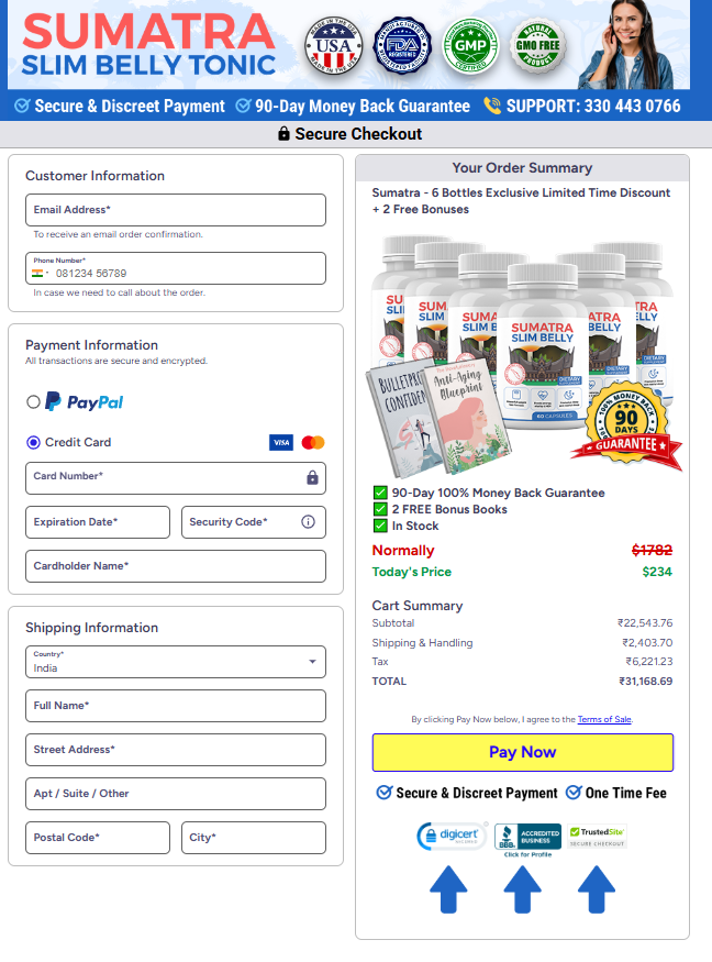 The instant you press “Buy Now,” you’ll land on our safe, SSL-encrypted payment page. Just provide your details, and your Sumatra Slim Belly Tonic purchase will be confirmed.